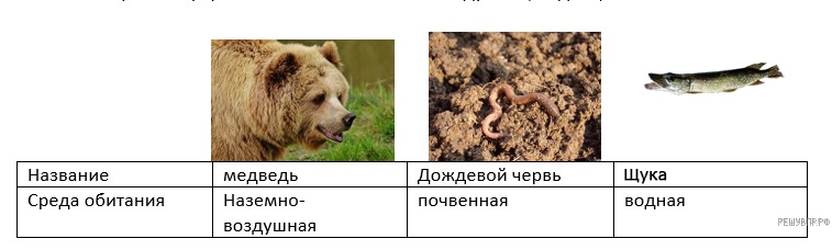 Под каждым названием подпишите название среды обитания взрослой формы животного: наземно-воздушная, водная, почвенная.