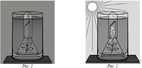 Николай, узнав об опытах Яна Ингенхаузена с водным растением элодеи (опыты проводились около 250 лет назад), решил их повторить. Он поместил растения в два стеклянных сосуда, а сверху накрыл воронками, которые, в свою очередь, сверху накрыл пробирками. Один стеклянный сосуд Николай поместил в тёмный шкаф (рис. 1), а другой — на подоконник (рис. 2). Через некоторое время в пробирке, которой была накрыта воронка с растением в сосуде на подоконнике, появились пузырьки газа, тогда как в сосуде, находящемся в шкафу, видимых изменений не наблюдалось.
