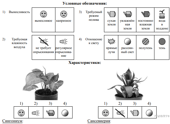 Опишите особенности растений сингониума и сансевиерии, которые необходимо учитывать при их разведении в домашних условиях, используя для этого таблицу условных обозначений.