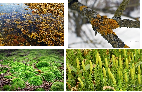 Подпишите их названия, используя слова из предложенного списка: плауны, мхи, лишайники, водоросли.