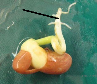 Арина рассмотрела прорастающее семечко фасоли под лупой. Что она должна обозначить под стрелкой на рисунке?