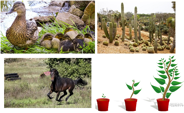 Соотнесите свойство живых организмов с изображениями, используя слова из предложенного списка: приспособленность, размножение, движение, рост.