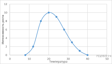 На рисунке изображен график зависимости интенсивности роста от температуры. Что занимало больше времени: увеличение интенсивности или её снижение?