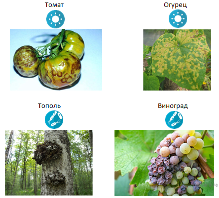 Распределите изображённые на рисунках растения в соответствии с инфекцией, которой они подвержены.