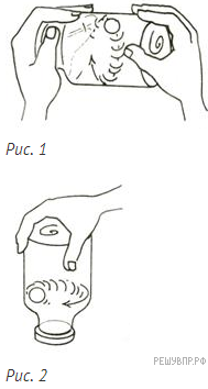 Для этого он поместил пластиковый теннисный шарик в пол-литровую стеклянную банку с небольшим отверстием. Держа банку в горизонтальном положении (рис. 1), Петя поместил в неё шарик и закрыл горлышко банки ладонью свободной руки. Далее он начал интенсивно вращать банку так, чтобы шарик, находящийся внутри, стал быстро перемещаться по стенке сосуда. После этого Петя перевернул банку, продолжая при этом вращательные движения. Как только она оказалась в положении горлышком вниз (рис. 2), Петя убрал ладонь от отверстия и прекратил вращать банку. Через короткое время шарик выпал из банки.