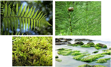 Подпишите их названия, используя слова из предложенного списка: хвощи, мхи, водоросли, папоротники.