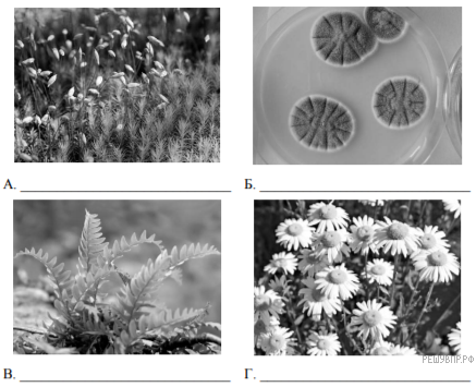 Подпишите их названия, используя слова из предложенного списка: покрытосеменные, мхи, папоротники,